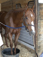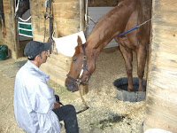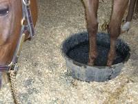 Here are photos of Ahvee’s Destiny with her feet in ice in Philadelphia. She’s been seen by Ian McKinley, the hoof specialist who worked on Big Brown before the Kentucky Derby in 2008. We’ve been expecting an abscess to appear and are soaking her feet in Epsom salts trying to accelerate the process.